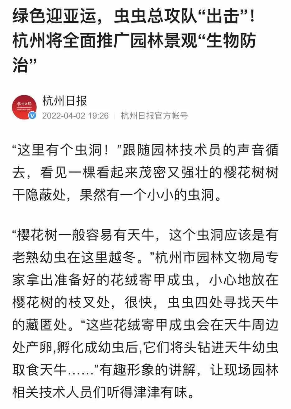 近期杭州日报报道:绿色迎亚运,虫虫总攻队“出击”!杭州将全面推广园林景观“生物防治”。